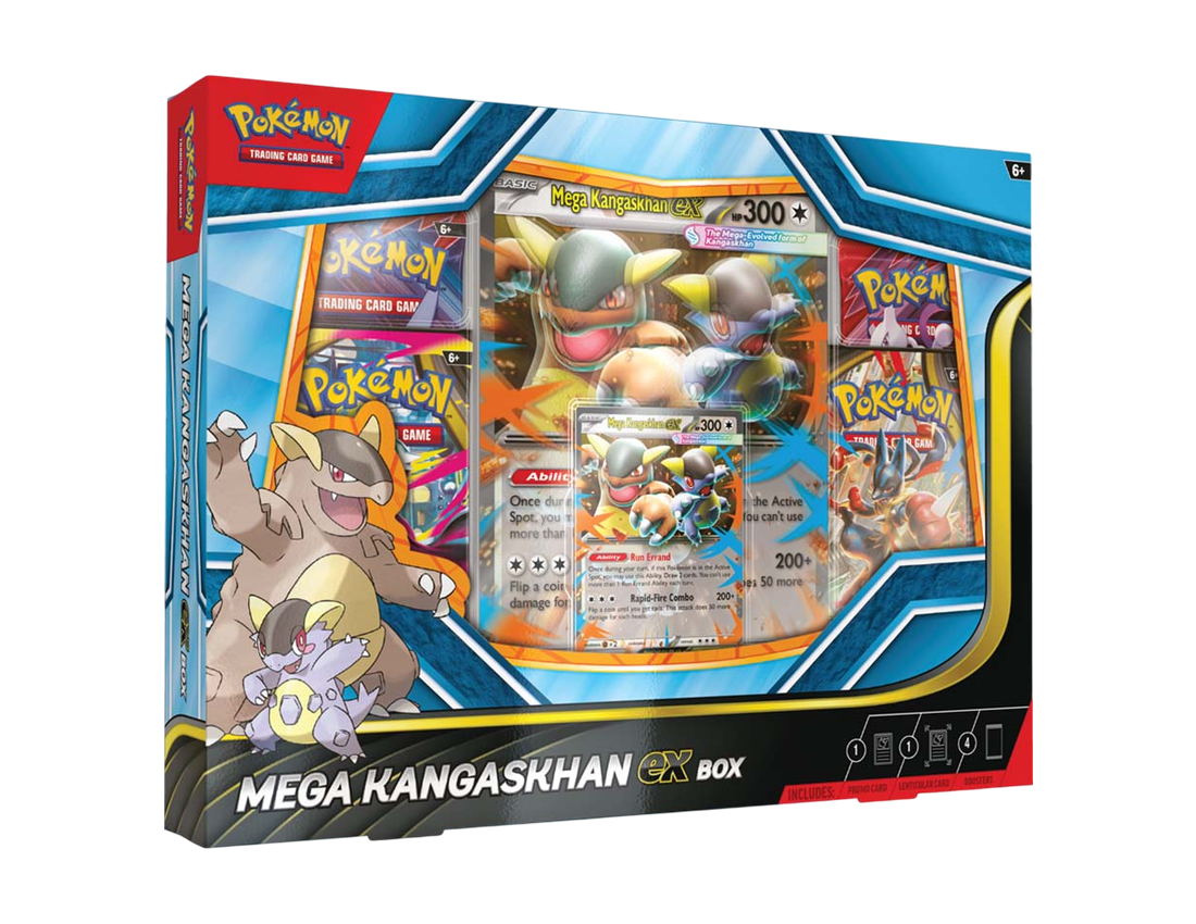Mega Evolution makes Kangaskhan’s child a force to be reckoned with—and both of them combine their powers as Mega Kangaskhan ex! Draw extra cards with Run Errand, then use Rapid-Fire Combo and flip coins to seek bigger damage. Team up with Mega Kangaskhan ex as a playable foil promo card and an oversize lenticular version for display, then open four booster packs to find even more cool cards!