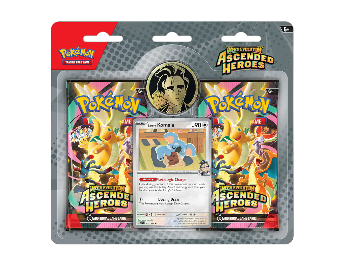 The Celadon City Gym, led by Gym Leader Erika, is filled with beautiful greenery and Grass-type Pokémon galore. Visitors to Medali in the Paldea region have the chance to battle Gym Leader Larry and his Normal-type Pokémon. In this collection, you’ll find a promo card featuring either Erika’s Tangela or Larry’s Komala, a metallic coin featuring your chosen Gym Leader, and two booster packs from the special Mega Evolution—Ascended Heroes expansion.